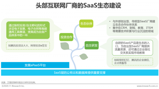 随着C端流量红利见底,国内互联网巨头逐渐有更大的动力探索B端增长,以阿里、腾讯为代表的头部互联网厂商从公有云入场B端,为进一步提升公有云覆盖力,扩大其在B端的市场份额,厂商们开始逐渐向上构建SaaS生态。如果说C端的竞争是流量的竞争,那么B端市场将会是生态的竞争。跨界而来的互联网厂商利用IaaS层技术沉淀,构建aPaaS应用市场,使得SaaS产品具有更强的扩展性和定制能力,而后从自主研发、投资并购和生态合作三个层级围绕优势产品建立SaaS生态,一方面作为被集成方为创业型SaaS厂商提供技术支持,另一方面也发挥流量和资金优势,现阶段以免费或低价的SaaS产品激活小微企业的使用意愿。