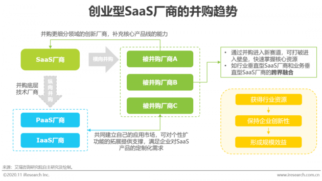 现今在一些细分赛道已经出现了较大体量的创业型SaaS厂商,在历经技术驱动的洗礼和业务体系趋于完整后,市场端的规模扩张逐渐成为发展趋势,产业内并购加剧。对于头部的创业型SaaS厂商而言,有两个主要的并购方向,第一是纵向并购,向产业链上游并购PaaS层厂商,加强SaaS厂商aPaaS平台的构建,以及IaaS层技术能力,自建公有云;第二是横向并购通过并购专注于创新业务、细分业务的厂商,保证自身的技术创新能力并增强垄断力,通过对企业已有业务体系的调整和补充,构建企业级SaaS产品生态,达到最佳经济规模。