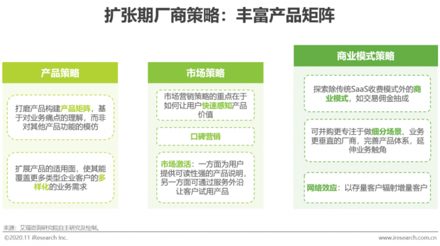 进入扩张期的创业型SaaS厂商,通常已有较高的客户留存率和续约率,最初的商业模式得到了市场验证,并且在行业内已拥有一定的口碑和影响力,下一步是如何突破中国SaaS行业厂商营收的天花板。SaaS厂商基本的用户增长逻辑是通过帮助客户解决实际应用中的问题获得用户粘性,而扩张期厂商可通过产品矩阵深化服务能力,并以不牺牲客单价为前提辐射更多新用户,实现教育市场、激活需求的目的。