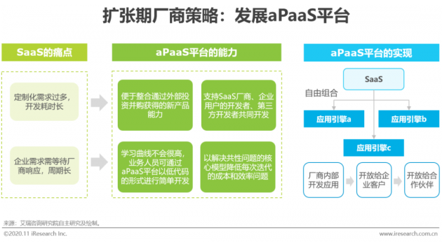 发展aPaaS(Application Platform as a Service)平台是扩张期厂商的一个技术策略,是指通过将业务或应用模块抽象和沉淀为通用能力,并以一个相对标准化的形式输出,支持SaaS厂商、企业用户和第三方开发者以较低成本进行二次开发和自主开发。aPaaS平台的产生既帮助厂商解决企业强定制化需求带来的研发成本上升和效率下降的问题,又为企业用户提供了自主迭代产品开发空间,创造更大的价值链。但是并不是所有厂商都需要、都有能力做aPaaS平台,既需要SaaS厂商有一定的业务和技术沉淀,也需要行业内客户存在共性需求,才能抽象出核心模型构建aPaaS平台。