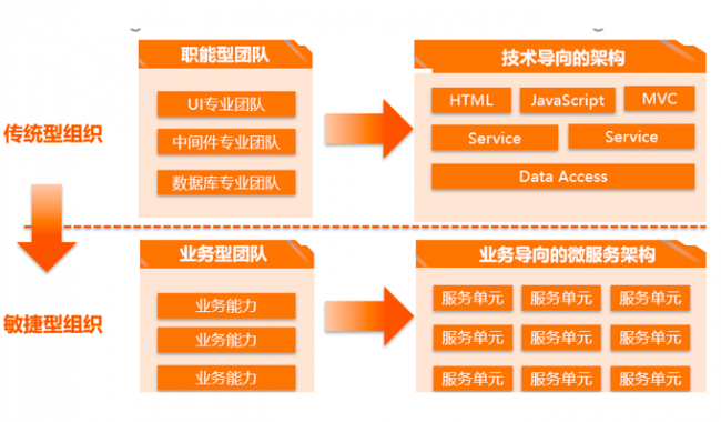 敏捷型组织不再有职能部门,只有业务部门,每个业务部门背后有很多服务单元,组织的技术架构变成业务导向的微服务架构。配合DevOps等流程和工具,企业可以摆脱开发和运维的束缚,把精力全部关注在业务上。