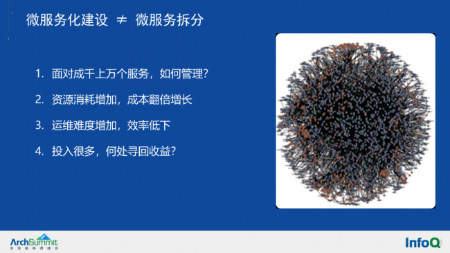 微服务拆分之后会面临以下问题:微服务拆分之后,成千上万个服务如何管理?资源消耗增加,甚至是翻倍增长。运维难度增加,效率低下。人力和时间成本投入增多,收益怎么找?