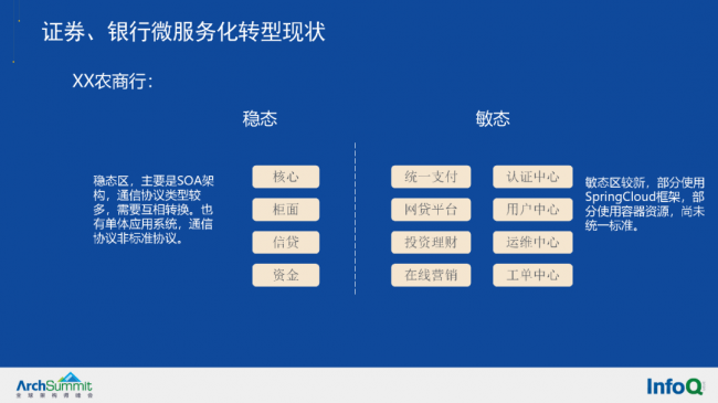 上图是我们某农商客户的微服务转型现状,这里用虚线隔开的代表网络隔离和网络区域。我们可以看到,通常银行的存款、贷款等核心系统会放在稳态区域,稳态区域的系统特点一是运行多年,二是技术架构陈旧(一般是SOA架构,还有单体系统)。另外,在比较靠外的网络区域,也就是敏态区域,通常会放一些非核心类的系统,如办公系统等。敏态区域的特点是一般采用新技术来做,即使是单体系统,也是用较通用的技术架构,或者通信协议。
