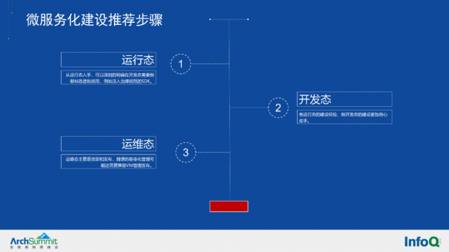 微服务化建设建议大家从运行态入手,第一步运行态,第二步开发态,第三步运维态。为什么先从运行态入手?从运行态入手,可以深刻地明确在开发态需要做哪些改造和规范,例如注入治理规范的 SDK。(关于为什么从运行态入手微服务化建设,我们会在下周的微服务系列文章中详细阐述)