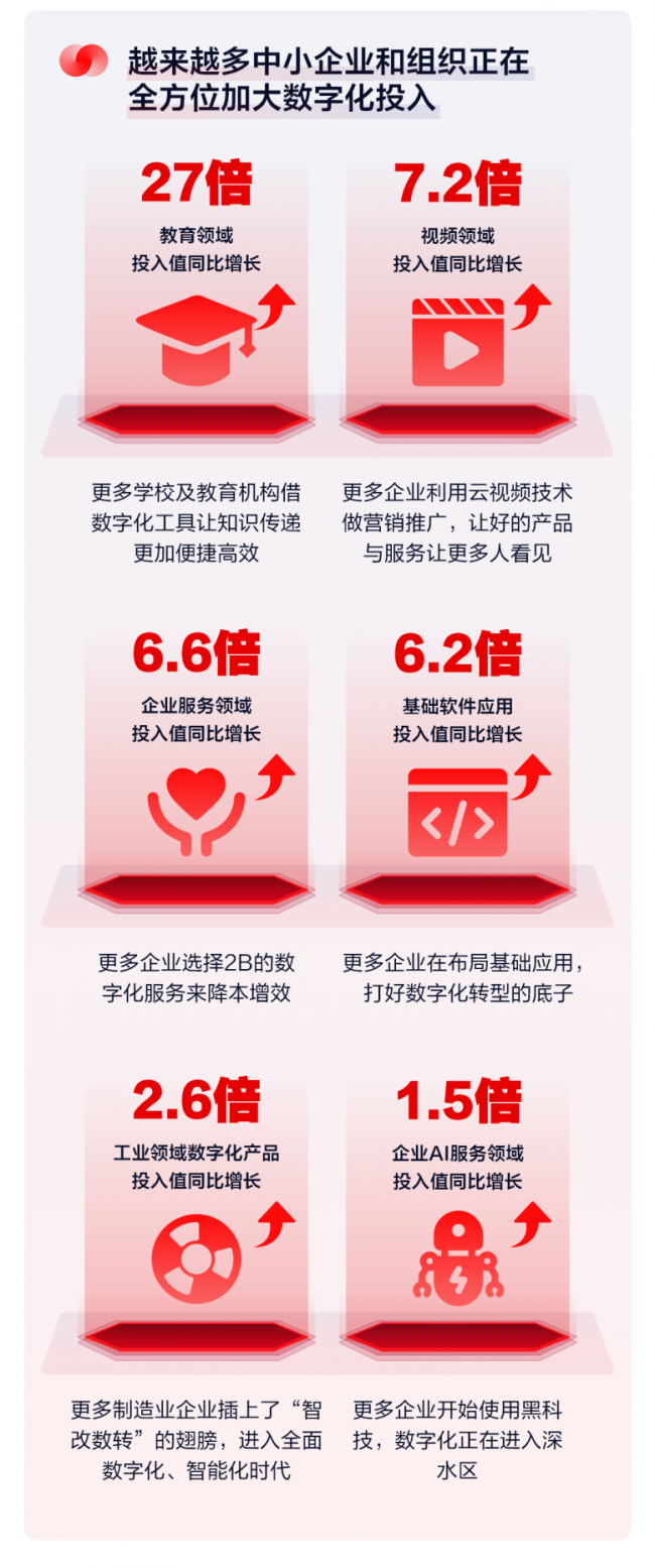 与此同时,B2B企业服务投入值同比增长6.6倍,基础软件应用则增长6.2倍,可以看到,越来越多的中小企业正在搭建数字化的基础设施,利用数字化服务工具来降本增效。