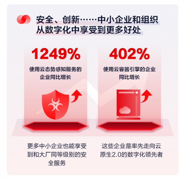 此外,越来越多的企业正在使用数字化工具来支持创新业务,如使用云容器引擎的企业同比增长402%,成为走向云原生2.0的数字化领先者。