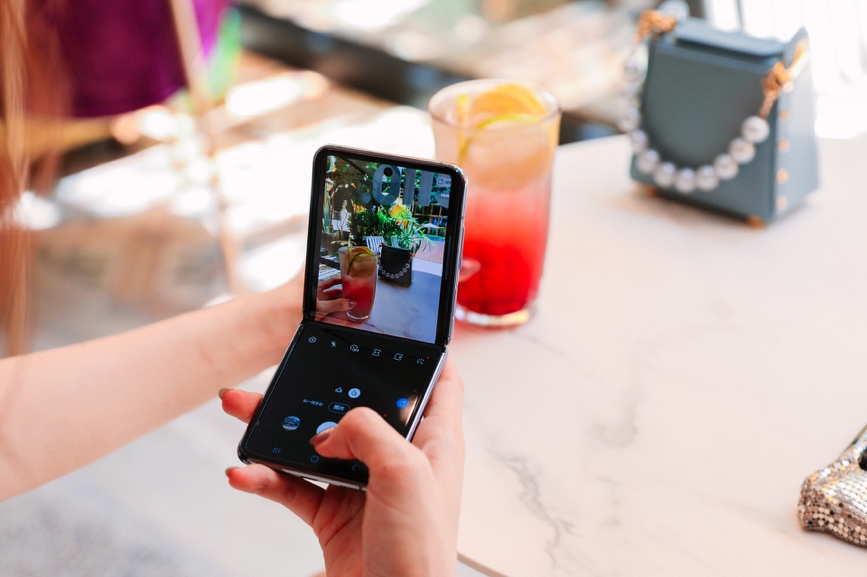 当Galaxy Z Flip 5G开启拍照功能并将其折叠至一定角度时,通过自适应分屏,屏幕可以将拍摄界面分成两部分,上屏为镜头取景框,下屏为摄影功能选项。你可以调整不同折叠角度,来轻松尝试不同拍摄视角。以往为了拍照拼出“表情包”,现在用一台三星Galaxy Z Flip 5G就能拍摄隐藏视角刷爆朋友圈。折叠屏拍照还有自带“三脚架”的妙用,将三星Galaxy Z Flip 5G放置在桌面或地面上,可以让直播、自拍、视频通话等更加稳定。而说到多任务处理功能,则可以同时开启2个应用程序,对于经常需要在商务社交、电话/视频会议等任务中来回切换的商务精英们,三星Galaxy Z Flip 5G的这一交互体验实在友好。